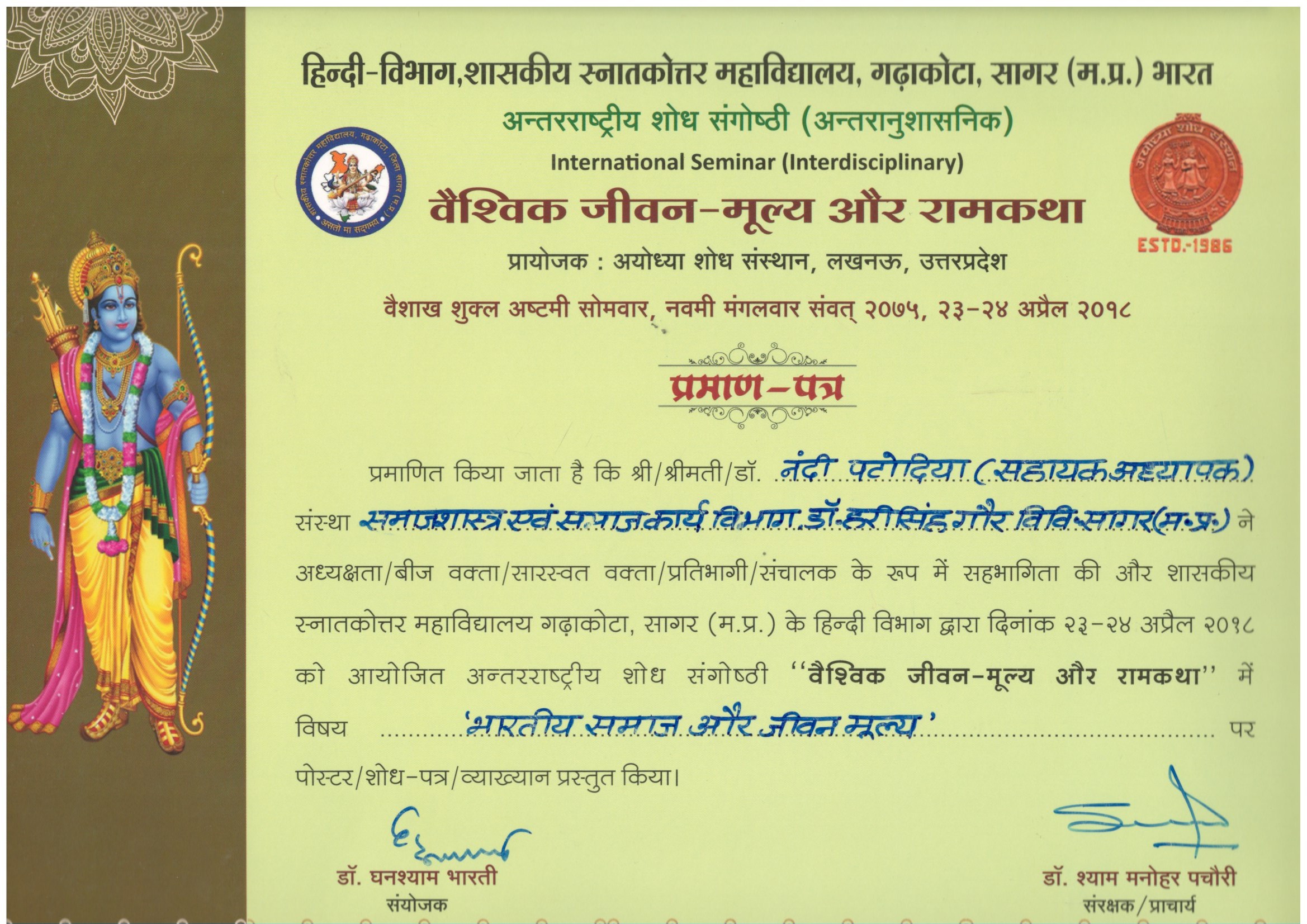 | Dr. Nandi Patodia | Bhartiya Samaj aur Jeevan Mulya, 23-24 April, 2018, Hindi Vibhag, Govt. Snatkottar Mahavidalaya, Garhakota, Sagar (M.P.) | 23-04-2018 To 24-04-2018 | Download |