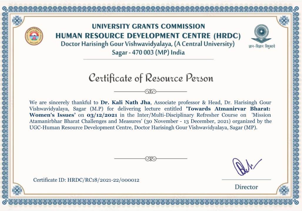 | Dr. Kali Nath Jha | Delivered a lecture entitled "Towards Atmanirbhar Bharat: Women's Issues' HRDC Dr. Harisingh Gour Vishwavidyalaya Sagar M.P. | 03-12-2021 | Download |
