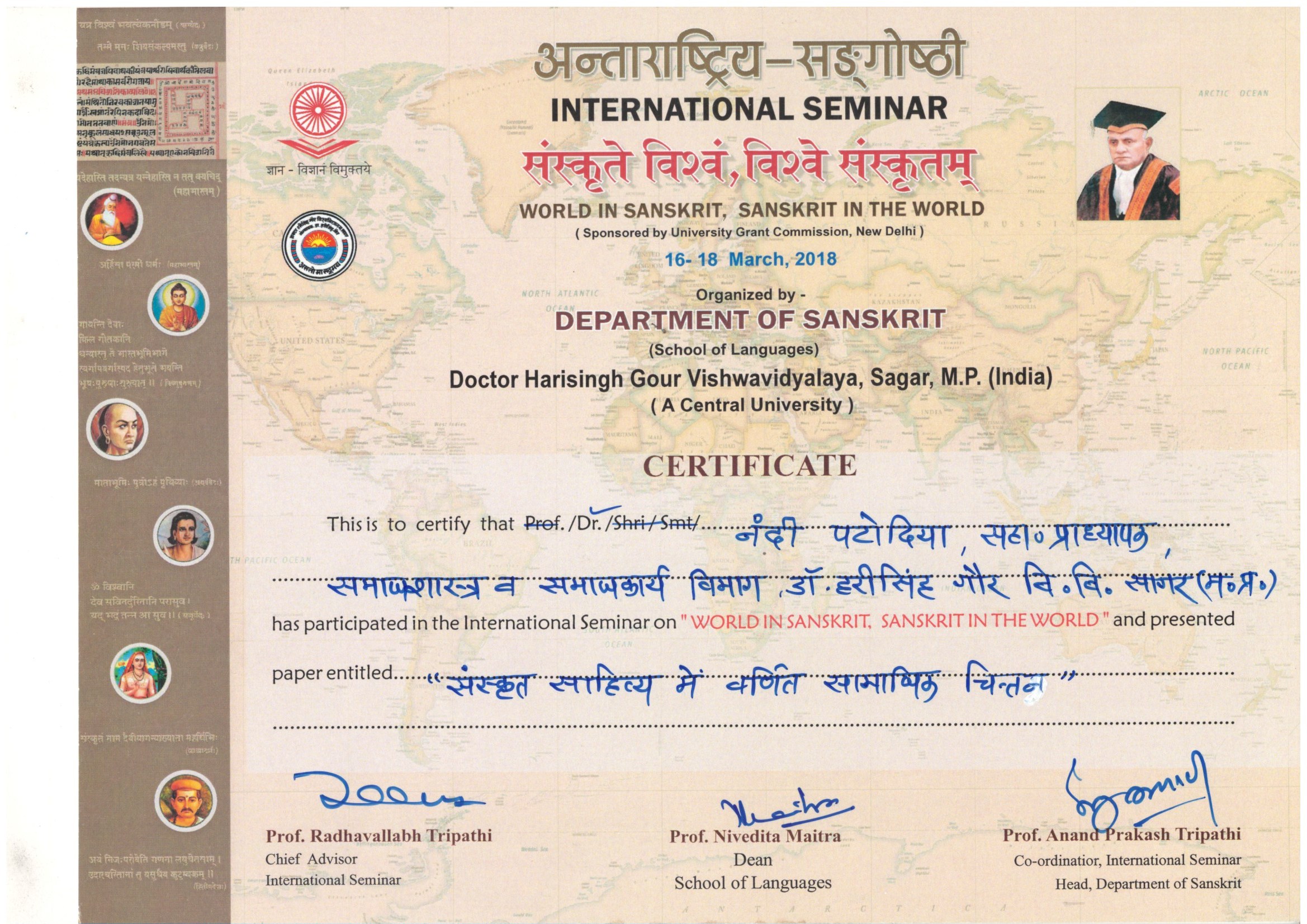 | Dr. Nandi Patodia | Sanskrit Sahitya Main Varnit Samajik Chintan, 16-18 March, 2018, Department of Sanskrit, Dr. Harisingh Gour University, Sagar (M.P.). | 16-03-2018 To 18-03-2018 | Download |