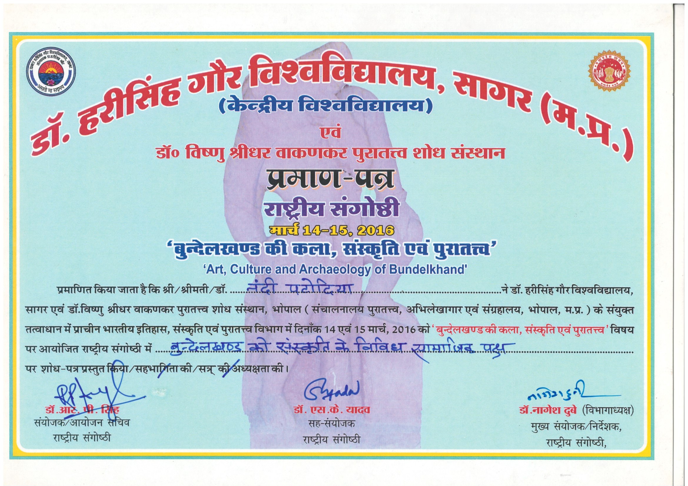 | Dr. Nandi Patodia | Bundelkhand ki Sanskriti Ke Vividh Samajik Paksh, Dr. Harisingh Gour V.V. Sagar (M.P.). | 14-03-2016 To 15-03-2016 | Download |