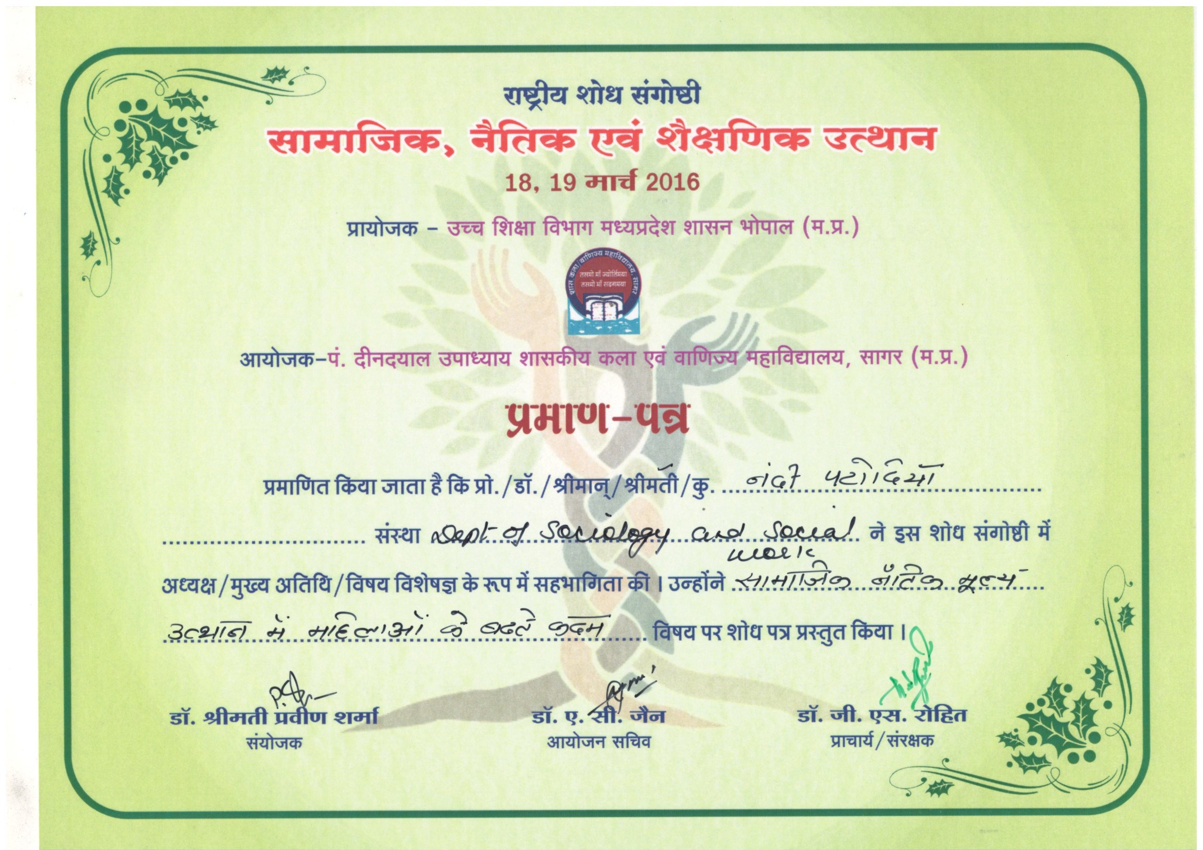 | Dr. Nandi Patodia | Samajik Naitik Mulya Utthan Main Mahilao Ke Bhadte Kadam, Pt. Deendayal Upadhya Govt. Kala evam Vadijya Mahavidalaya, Sagar (M.P.). | 18-03-2016 To 19-03-2016 | Download |