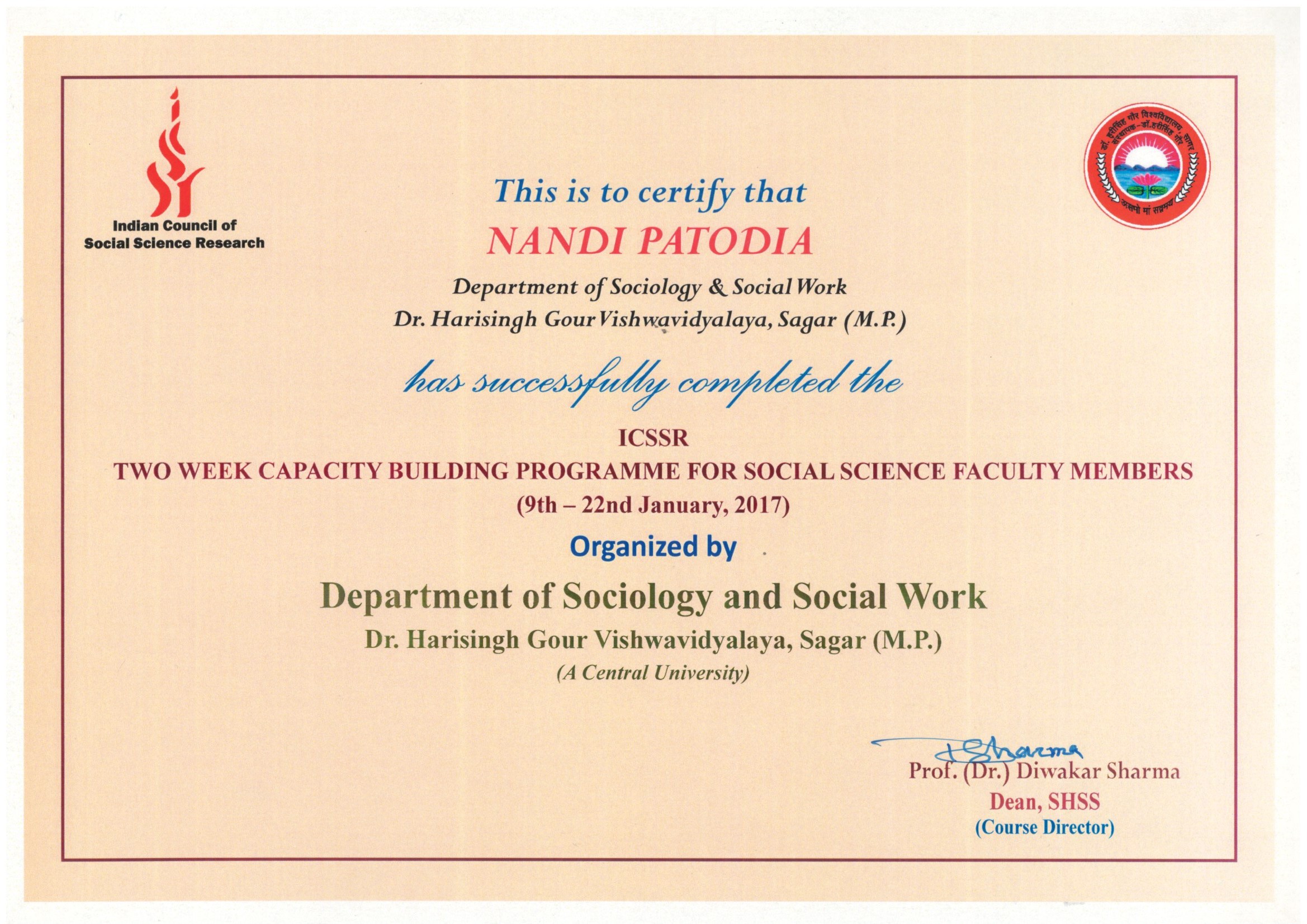 | Dr. Nandi Patodia | Two Week Capacity Building Programme for Social Science Faculty Members, 9-22 Jan. 2017, Department of Sociology and Social Work, Dr. Harisingh Gour University, Sagar (M.P.). | 09-01-2017 To 22-01-2017 | Download |