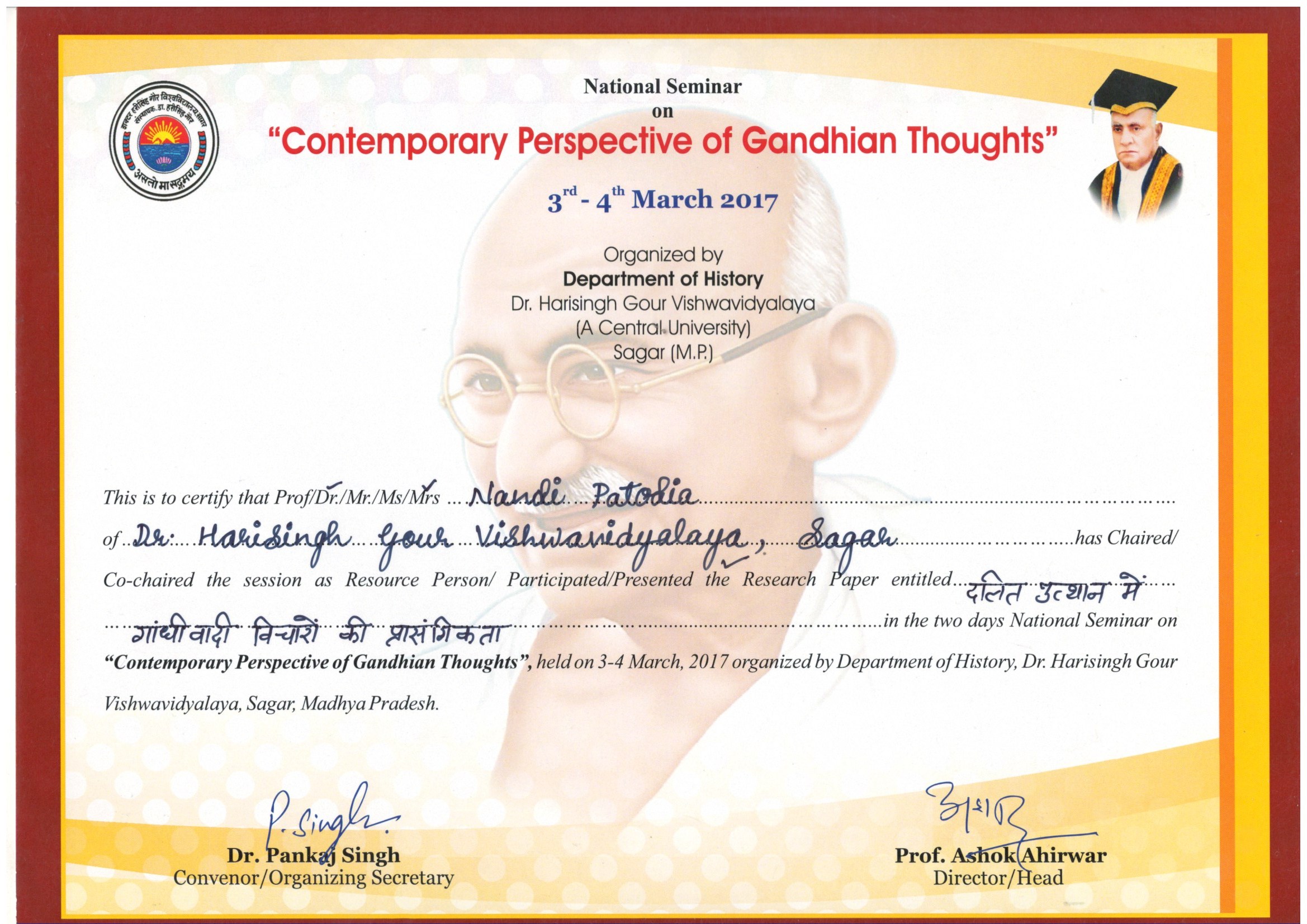 | Dr. Nandi Patodia | Dalit Utthan main Ghandivadi Vichario ki Pransgikta, 03-04 March, 2017, Department of History, Dr. Harisingh Gour University, Sagar (M.P.). | 03-03-2017 To 04-03-2017 | Download |