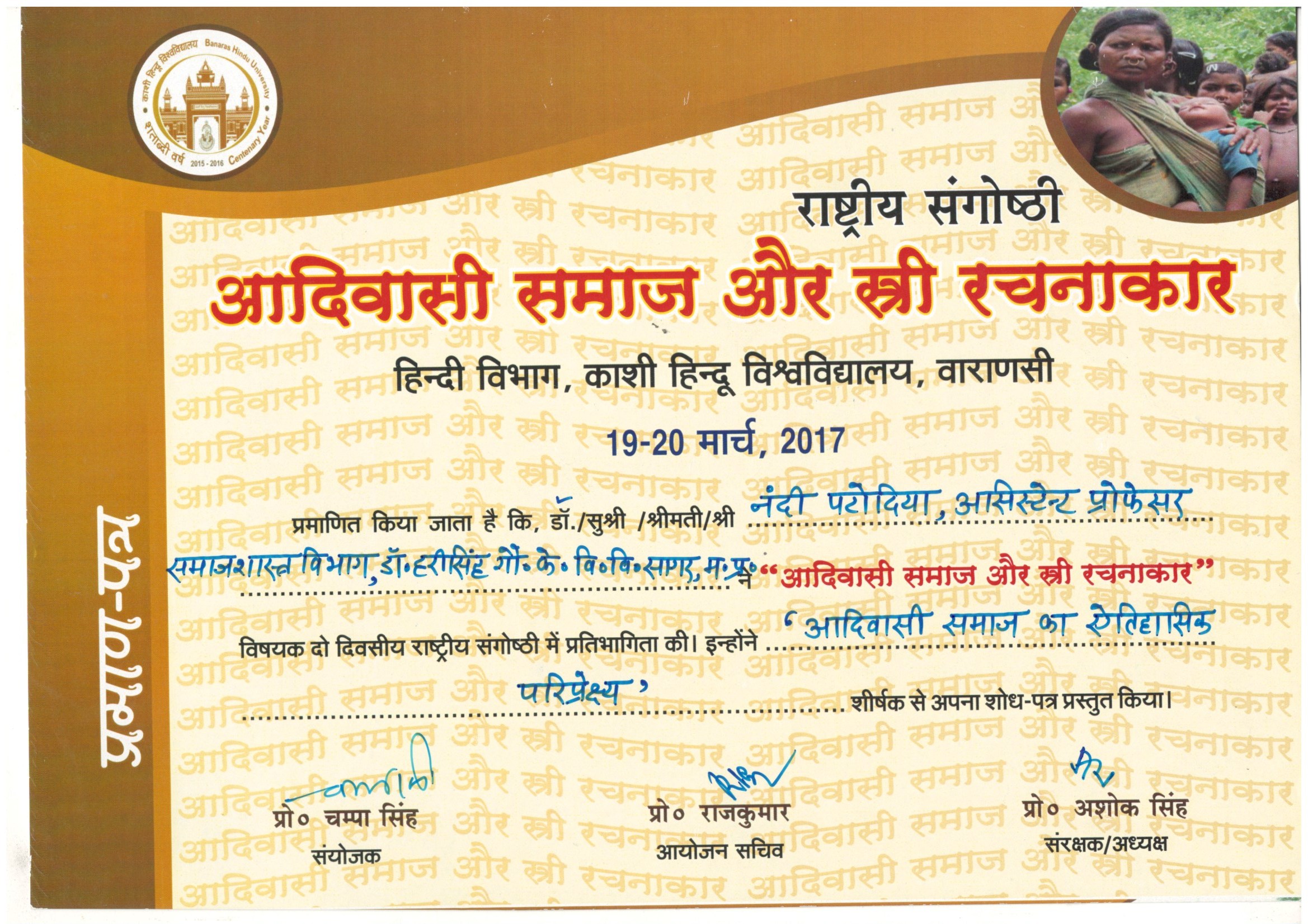 | Dr. Nandi Patodia | Adivasi Samaj ka Etihashik Paripekshya, 19-20 March, 2017, Hindi Vibhag, Kashi Hindu V.V., Varanasi. | 19-03-2017 To 20-03-2017 | Download |
