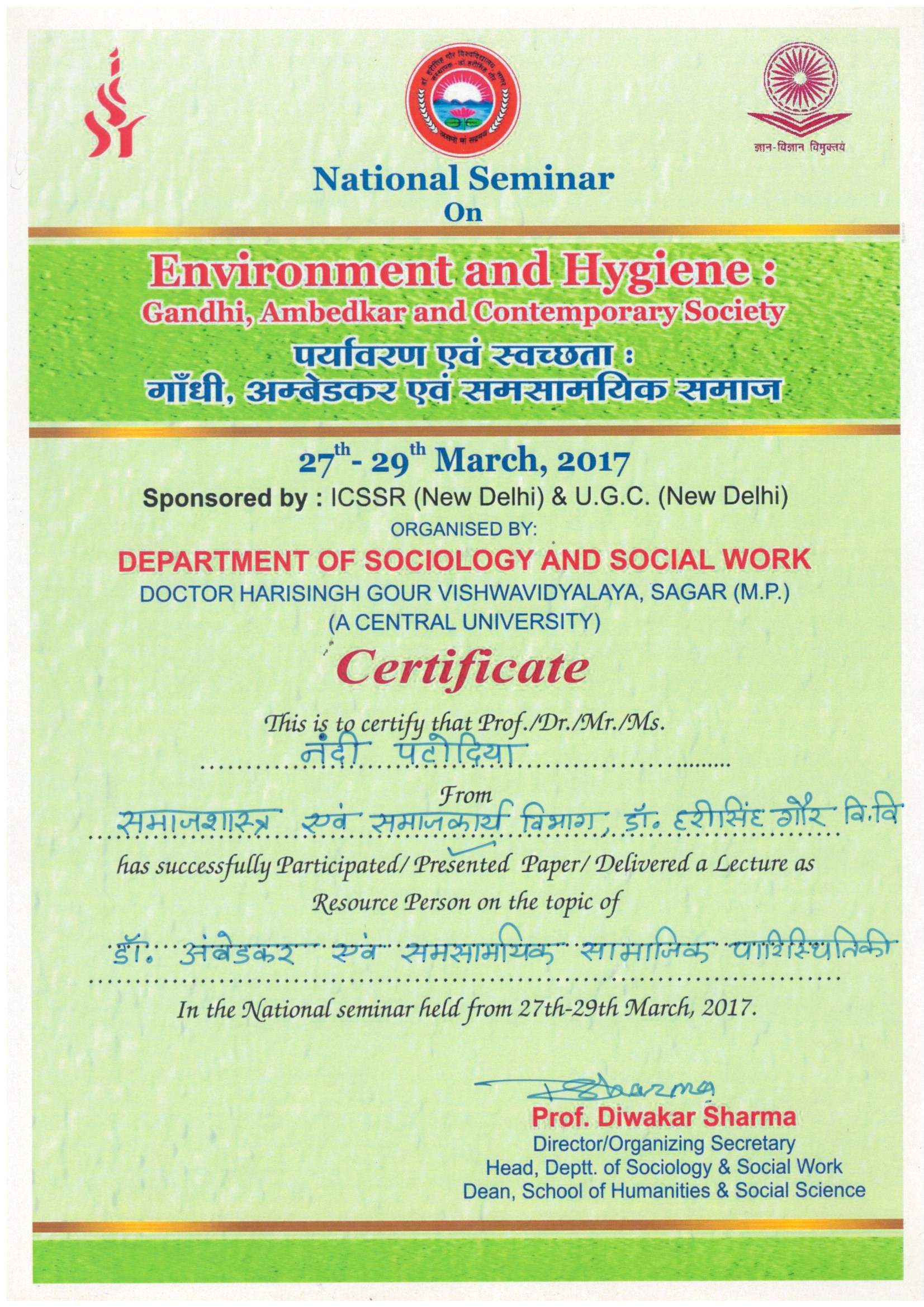 | Dr. Nandi Patodia | Dr. Ambedkar Evam Samsamyik Samajik Paristhiki, 27-29 March, 2017, Department of Sociology and Social Work, Dr. Harisingh Gour University, Sagar (M.P.). | 27-03-2017 To 29-03-2017 | Download |