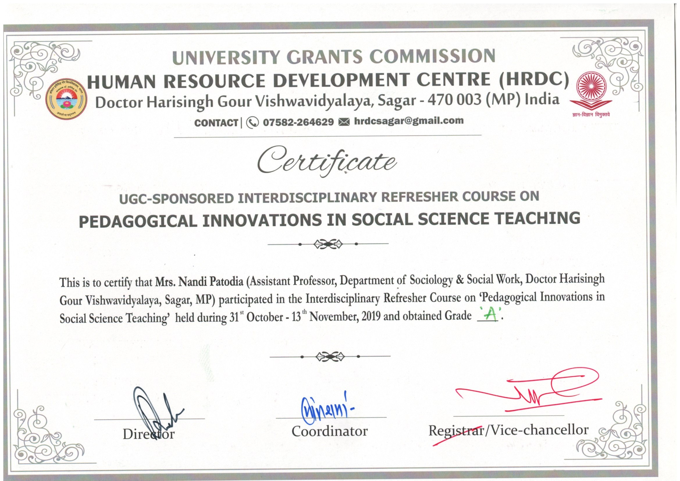 | Dr. Nandi Patodia | UGC Sponsored Refresher Course on "Pedagogical Innovations in Social Science Teaching" held during 31 October to 13th November, 2019 in HRDC, Doctor Harisingh Gour Vishwavidyalaya, Sagar (M.P.) | 31-10-2019 To 13-11-2019 | Download |