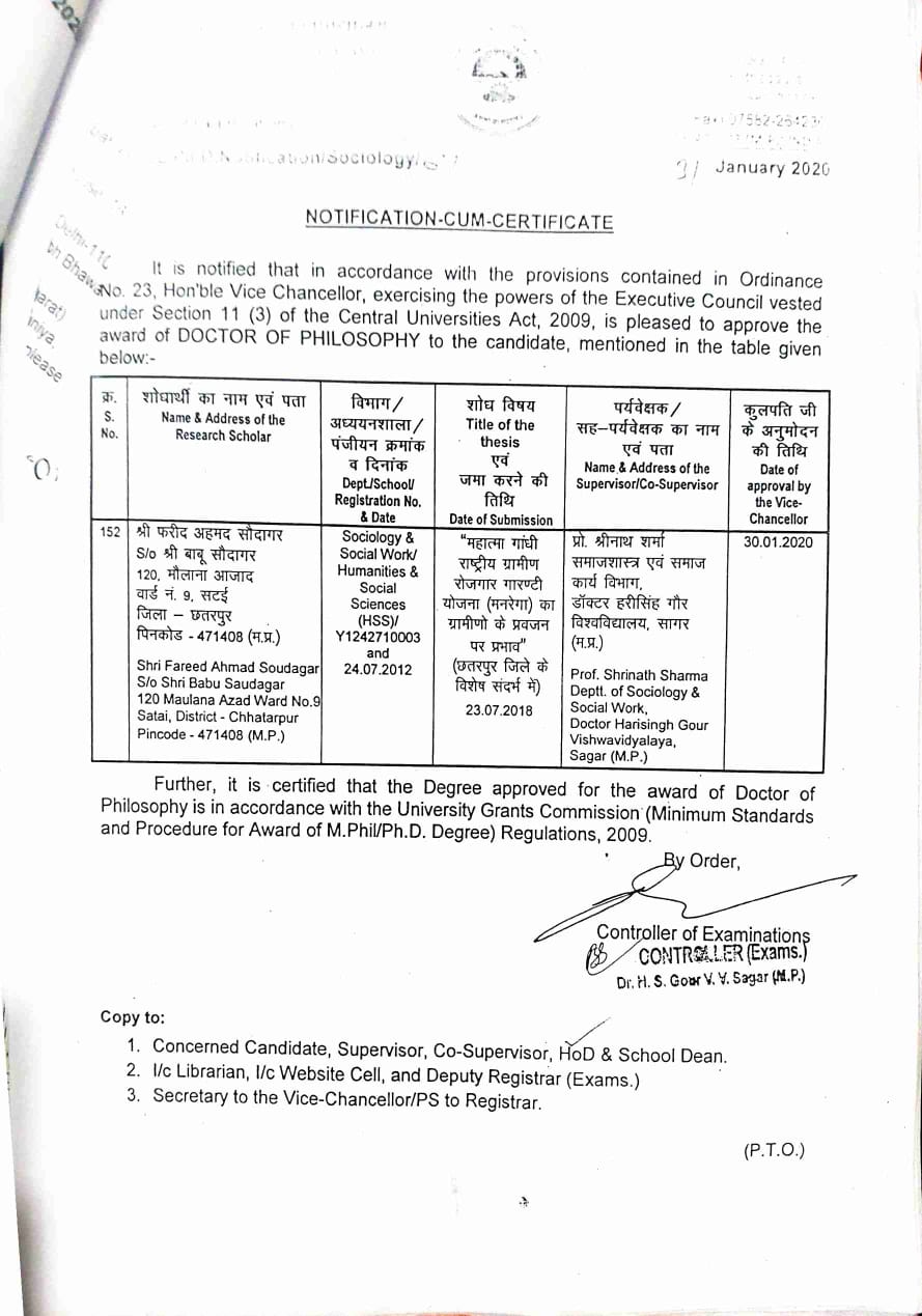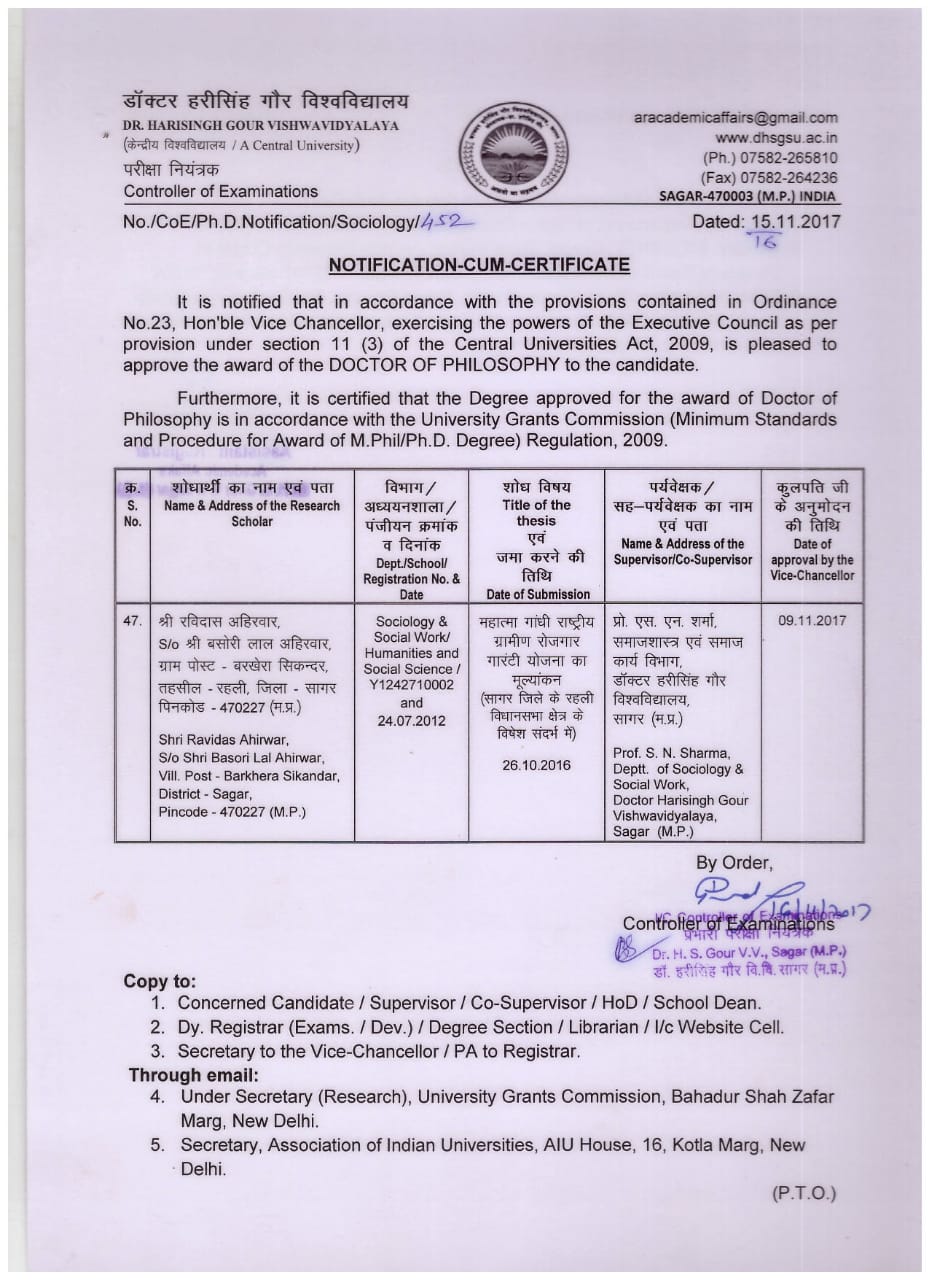 | 2017-18 | Ravidas Ahirwar | Y1242710002 | NET | Mahatma Gandhi Rashtriya Gramin Rojgar Guaranti Yojna Ka Mulyakan(Sagar Zile ke Rahli Vidhan Sabha Kshetra) Ke Vishesh Sandarbh Mein | Prof. S. N. Sharma | Download |