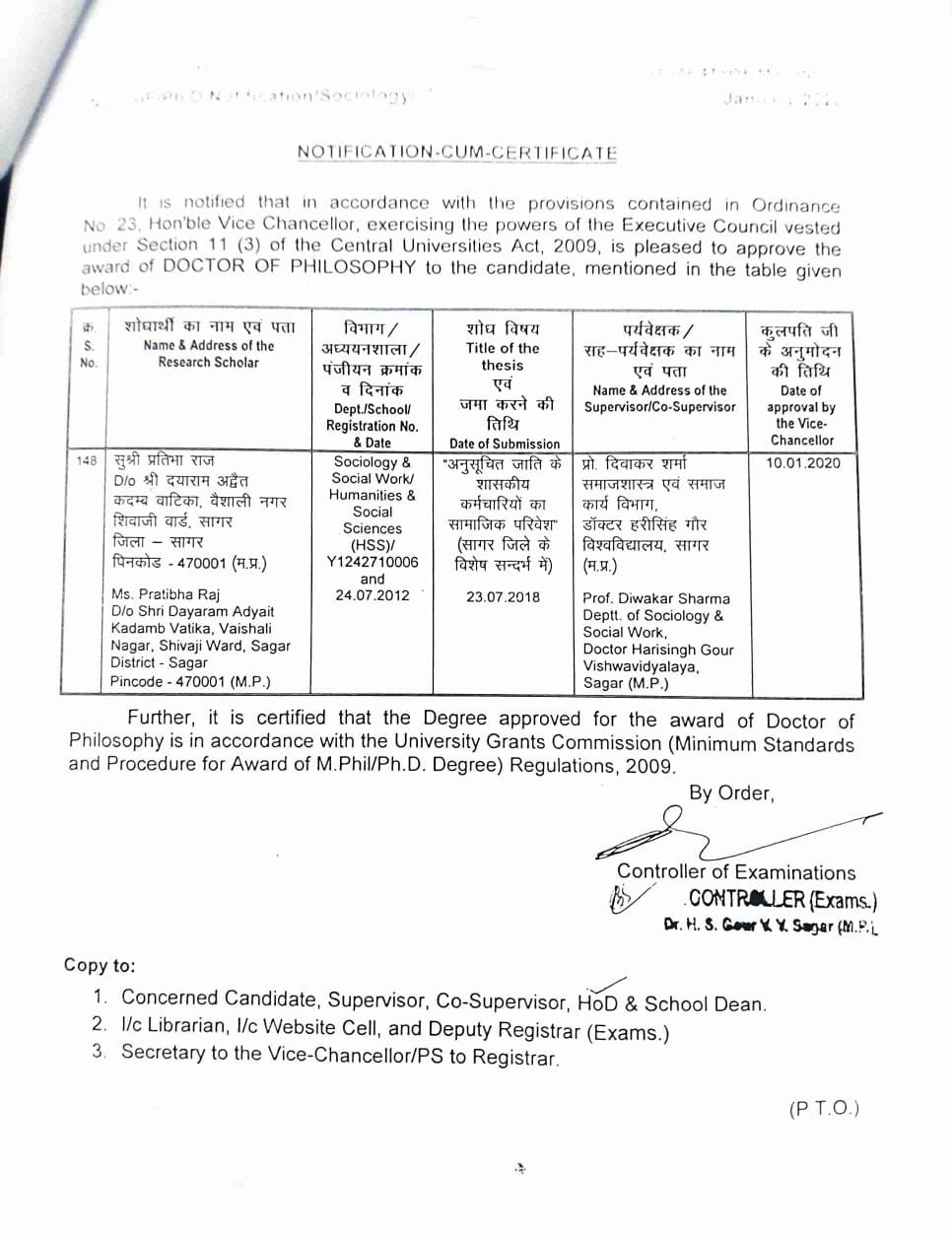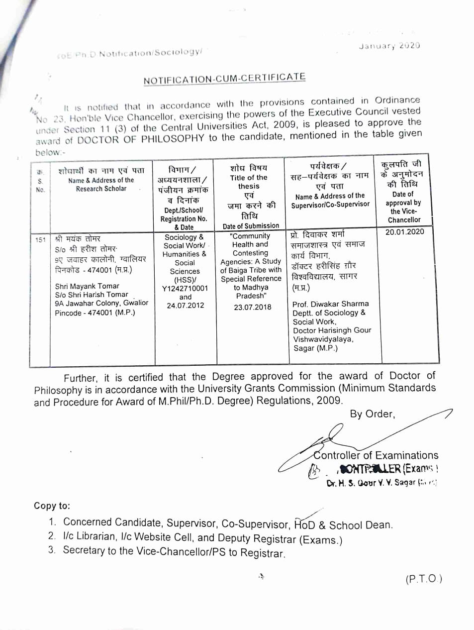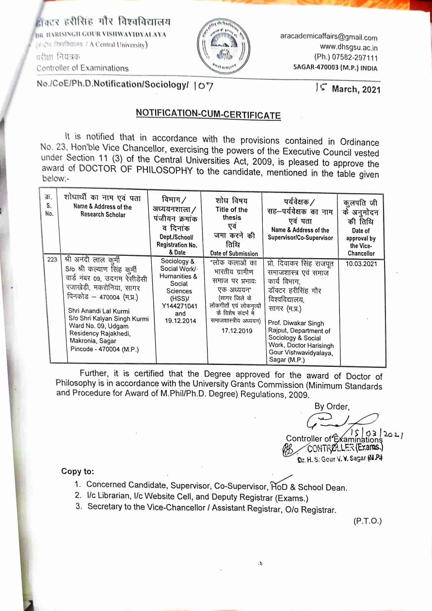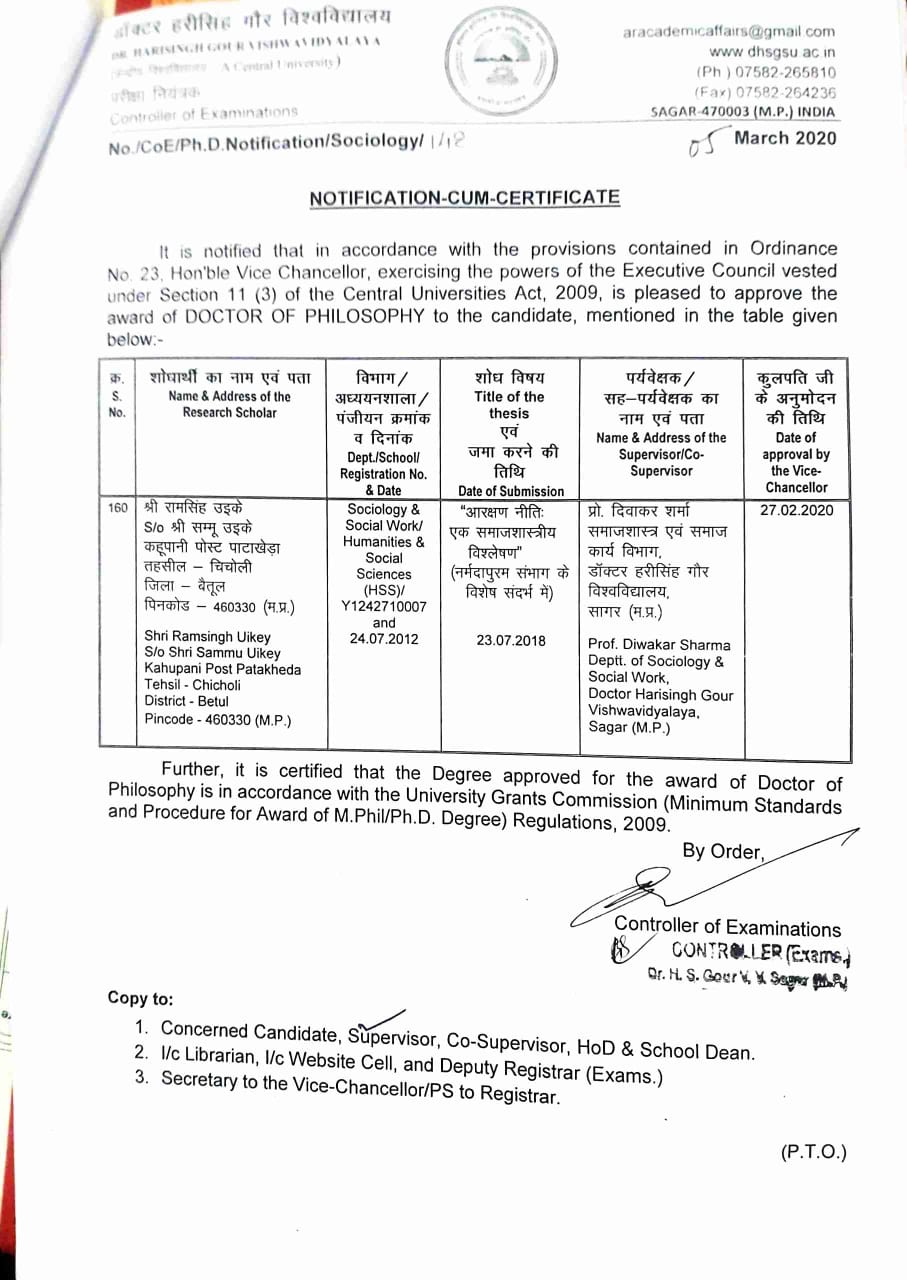 | 2019-20 | Ramsingh Uikey | Y1242710007 | RGNF(SRF) | Aarakchan Niti : Ek Samajshastriya Vishleshan (Narmadapuram Sambhag ke Vishesh Sandarbh Me) | Prof. Diwakar Sharma | Download |