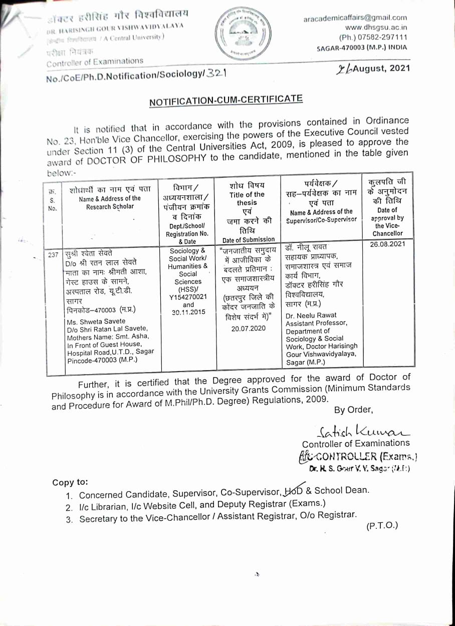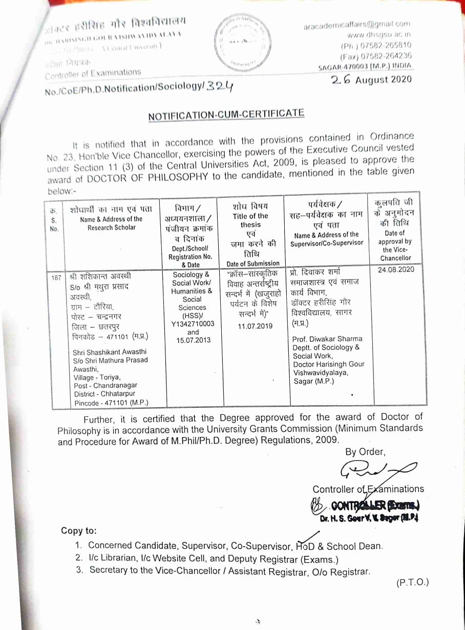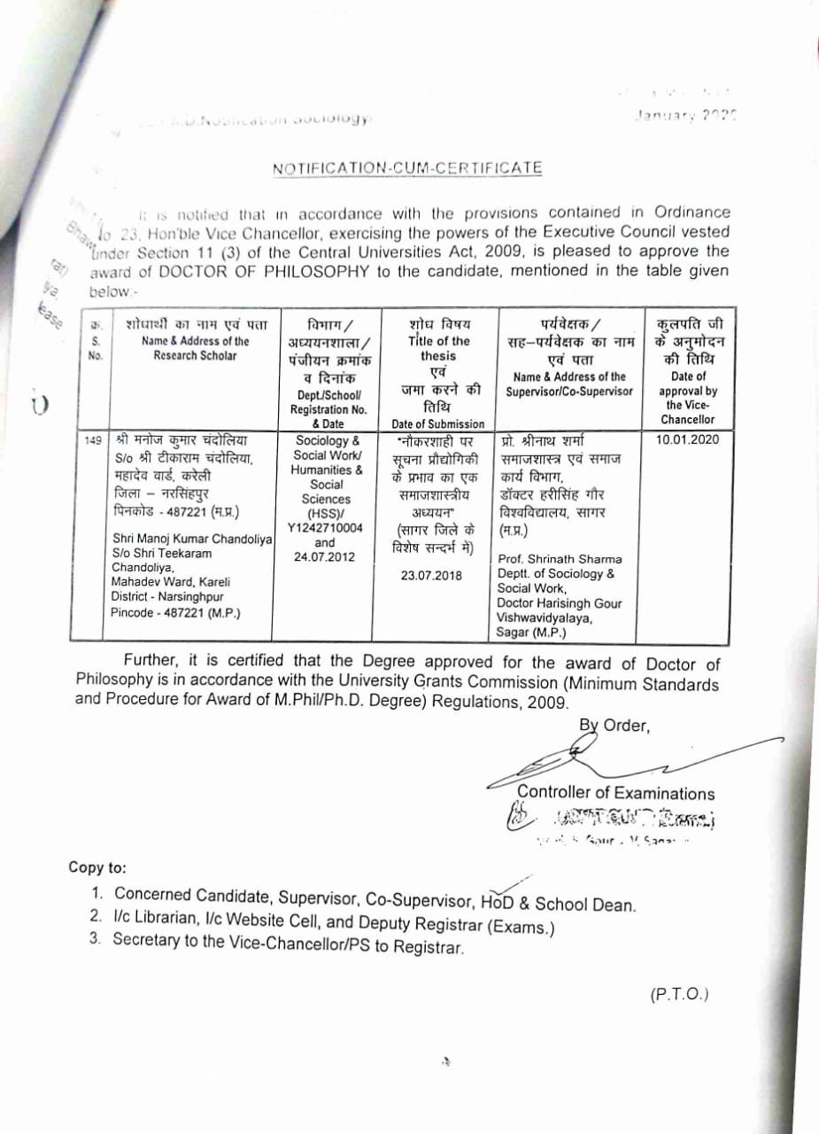 | 2019-20 | Ramsingh Uikey | Y1242710007 | RGNF(SRF) | Aarakchan Niti : Ek Samajshastriya Vishleshan (Narmadapuram Sambhag ke Vishesh Sandarbh Me) | Prof. Diwakar Sharma | Download |
