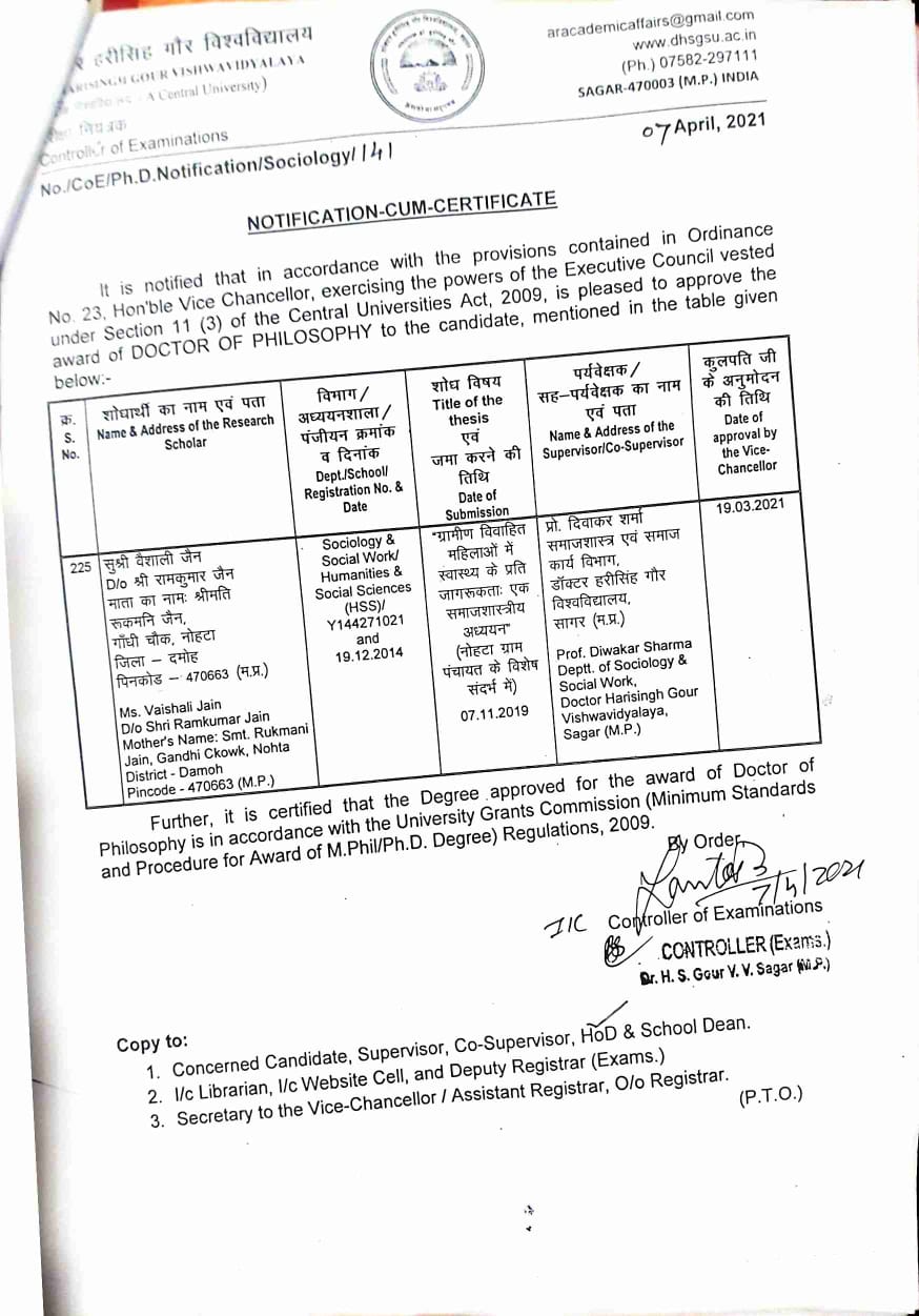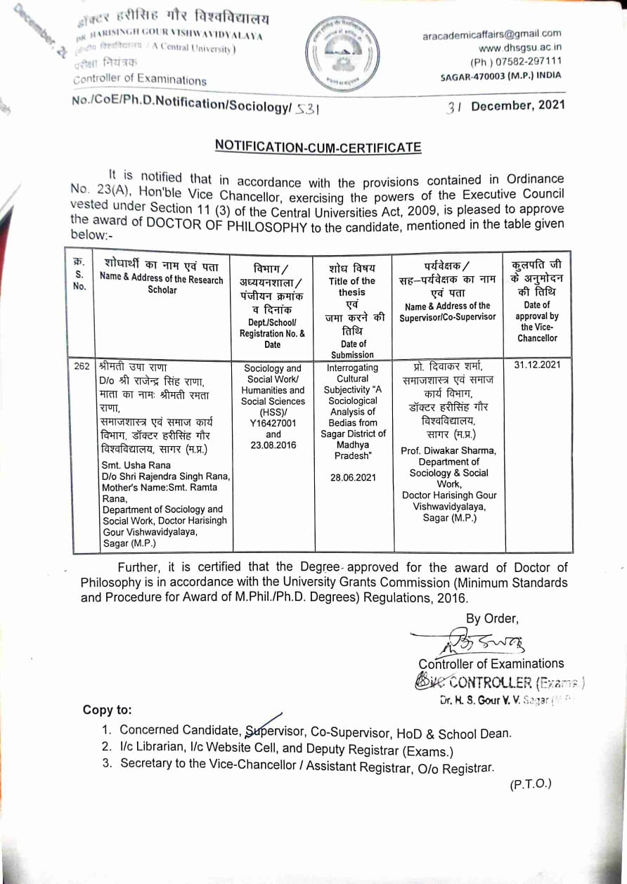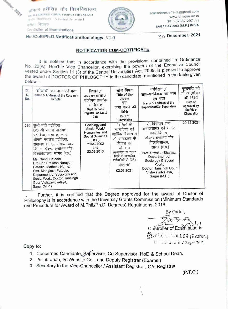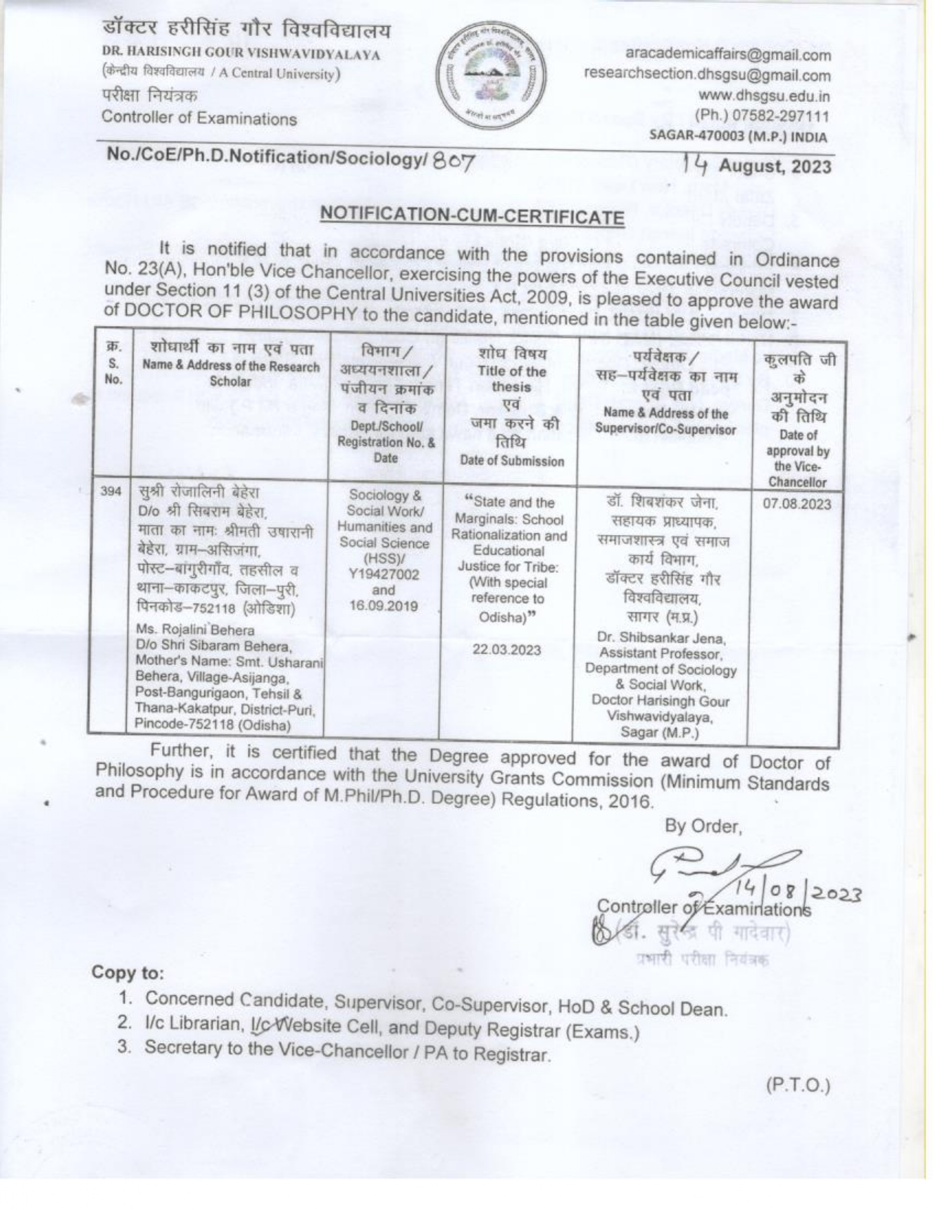 | 2019-20 | Ramsingh Uikey | Y1242710007 | RGNF(SRF) | Aarakchan Niti : Ek Samajshastriya Vishleshan (Narmadapuram Sambhag ke Vishesh Sandarbh Me) | Prof. Diwakar Sharma | Download |