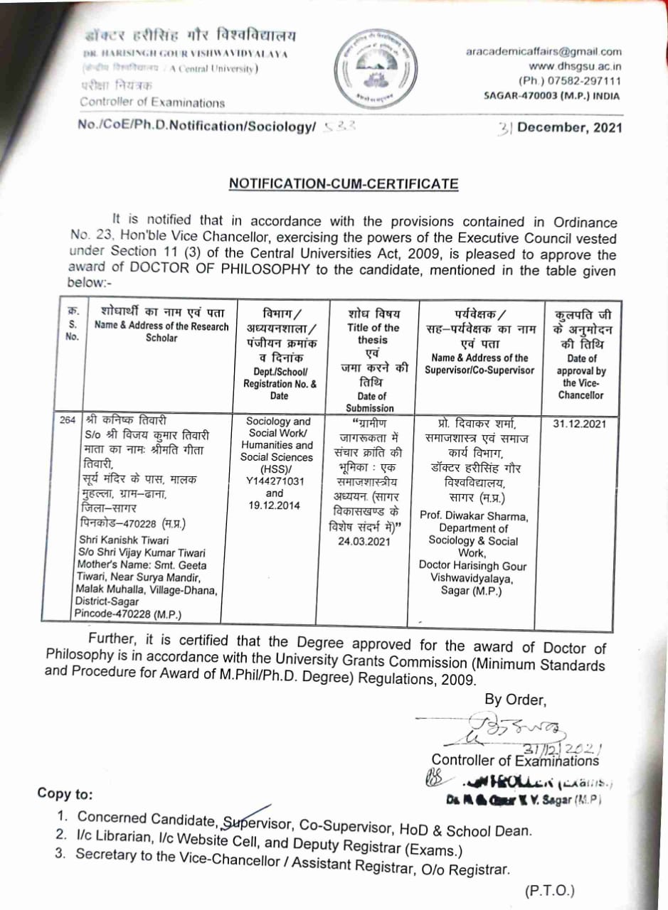 | 2023-24 | Deepak Kumar Rajak | Y164270054 | NET | Impact of Rural Development Programmes on Life Style of Sahariya Tribal Women (With Special Reference to Shivpuri District ) | Dr. Kali Nath Jha | Download |