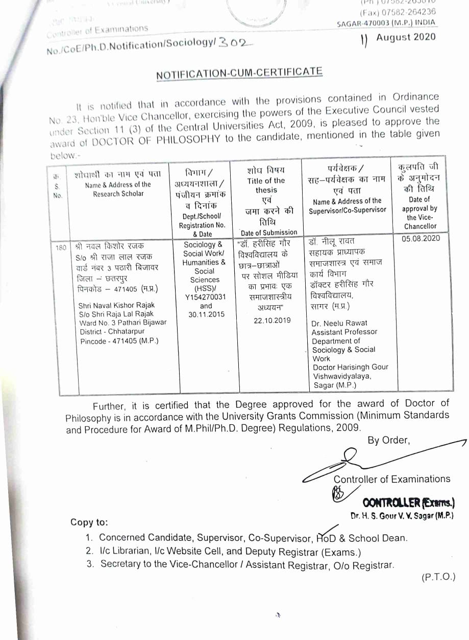 Dr. Harisingh Gour Vishwavidyalaya ke Chatr-Chatron par Social Media ka Prabhav: Ek Samajshastriya Adhyan |