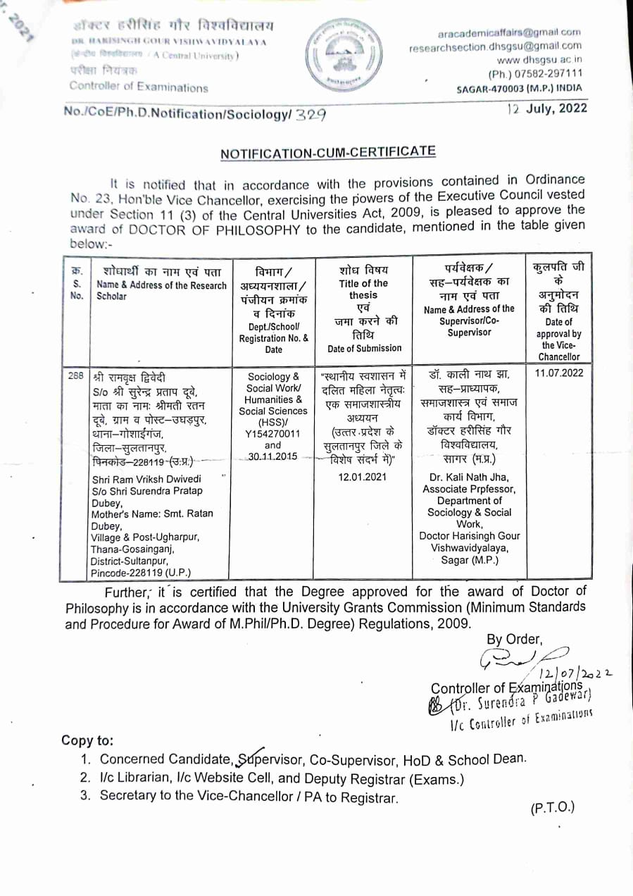 | 2022-23 | Ramvrisksh Dwivedi | Y15427001 | NET(ICSSR) |