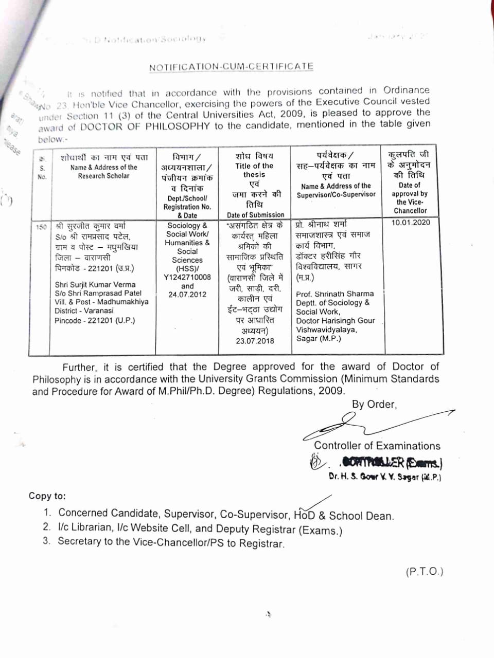 | Surjit Kumaar Verma | Y1242710008 | JRF (SRF) | Asngthit Chetra ke Karyarat Mahila Shramikon ki Samajik Psthiti Evam Bhumika (Varanasi Zile me Jari, Sari, Dari,Kalin Evam Ent Bhatta Udyog Par Aadharitr Adhyayan) | Prof. S. N. Sharma | Download | |