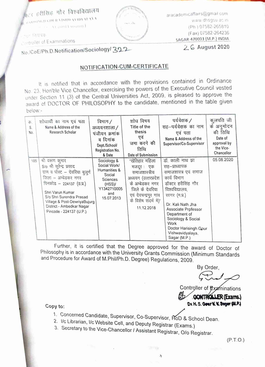 | 2020-21 | Varun Kumar | Y1342710005 | JRF(SRF) | Khetihar Mahila Majdoor: Ek Samajshastriya Adhayan,(Uttar pradesh ke Ambedekar Nagar zile ke Devariya Bujugra aur Devechandpur Goan ke vishesh sandarbh me) | Dr. Kali Nath Jha | Download |