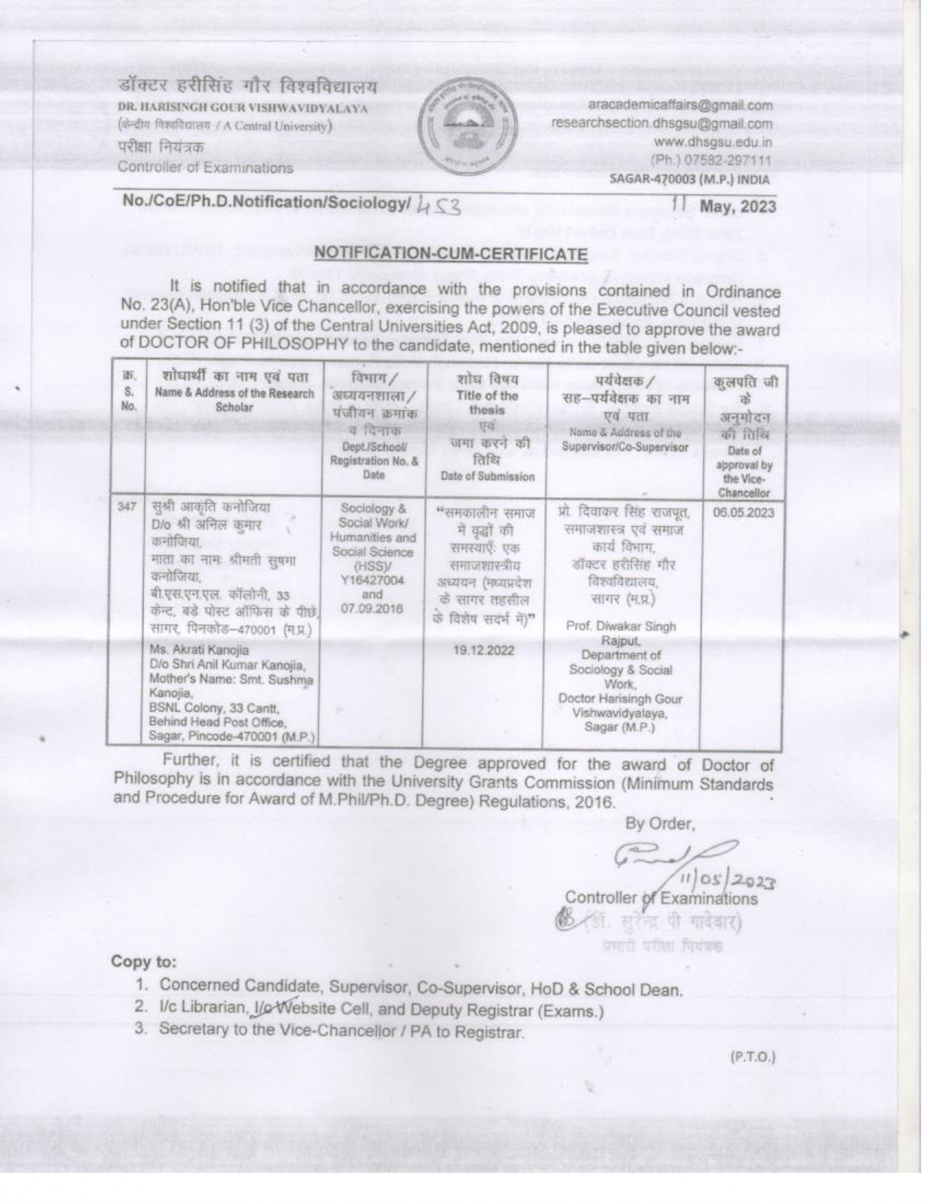 | Akrati Kanojia | Y164270044 | - | Samkalin Samaj me Vriddhon ki Samasyain : Ek Samajshastriya Adhyayan (Madhya Pradesh ke Sagar Nagar ke Vishesh Sandarbh me) | Prof. D.S.Rajput | Download | |