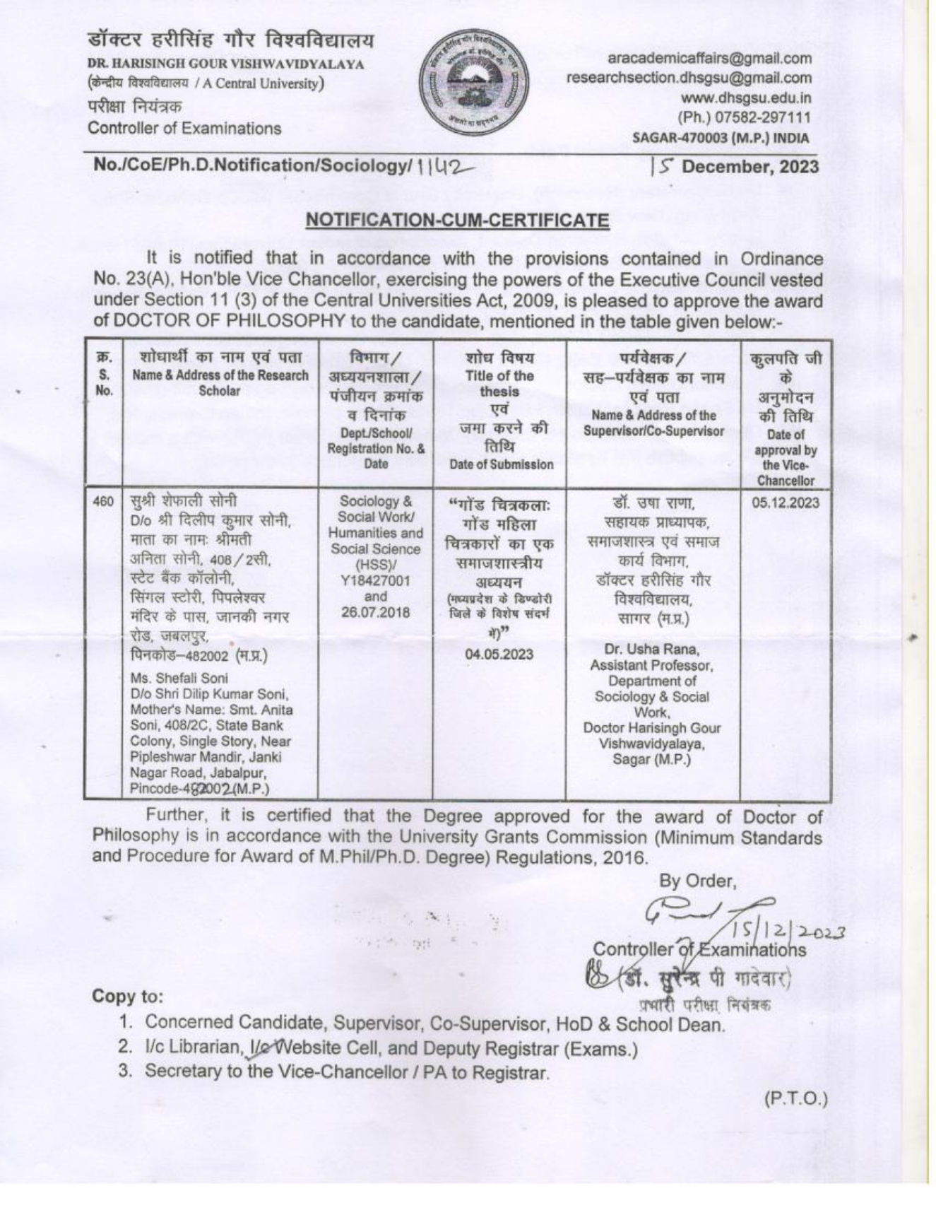 | Shefali Soni | Y18427001 | - | Gond Chitrakala : Gond Mahila Chitrakaron ka Ek Samajshastriya Adhyayan (Madhya Pradesh ke dindori Zile ke Vishesh Sandarbh Me) | Dr. Usha Rana | Download | |