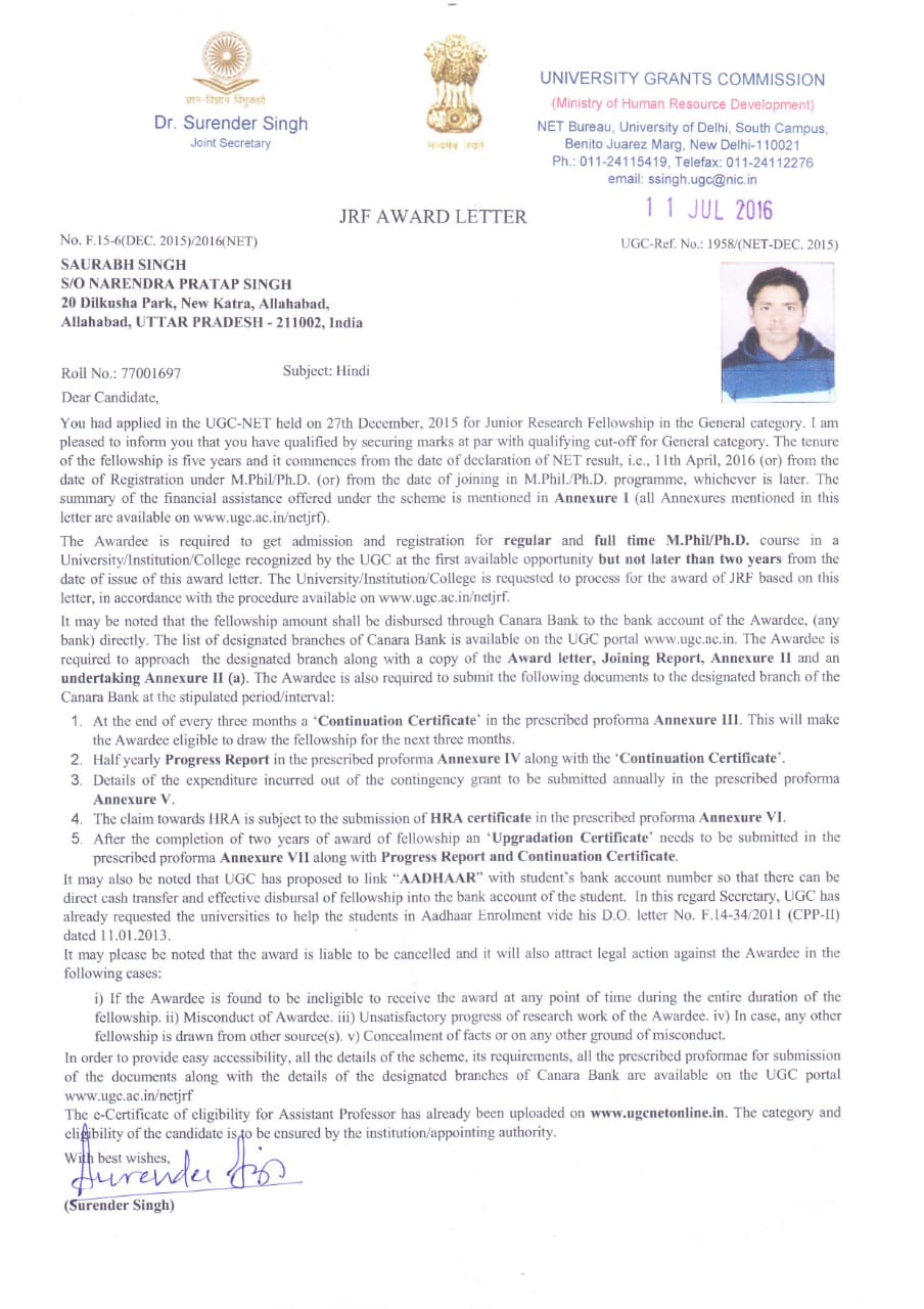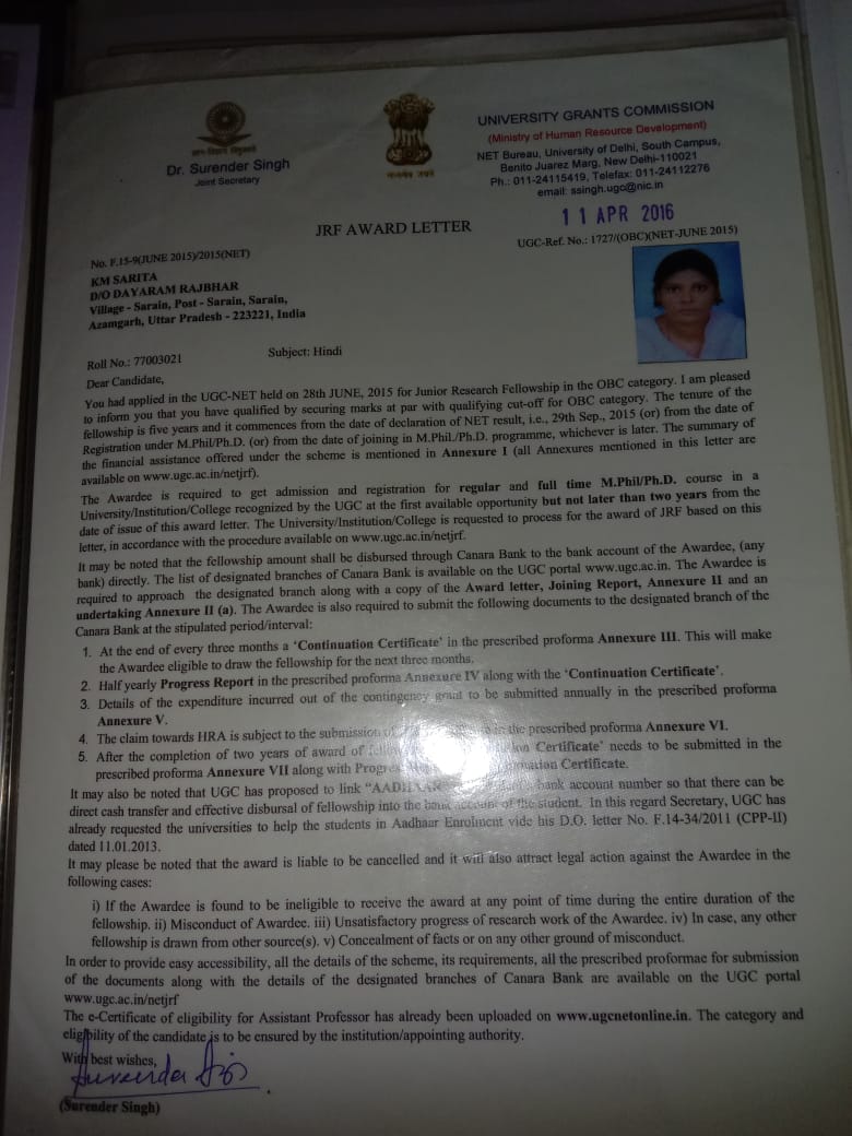 | 6 | Jugul Kishor Chaudhary | 2016 | 2016-2021 | JRF/RGNF | UGC | NET | Link |