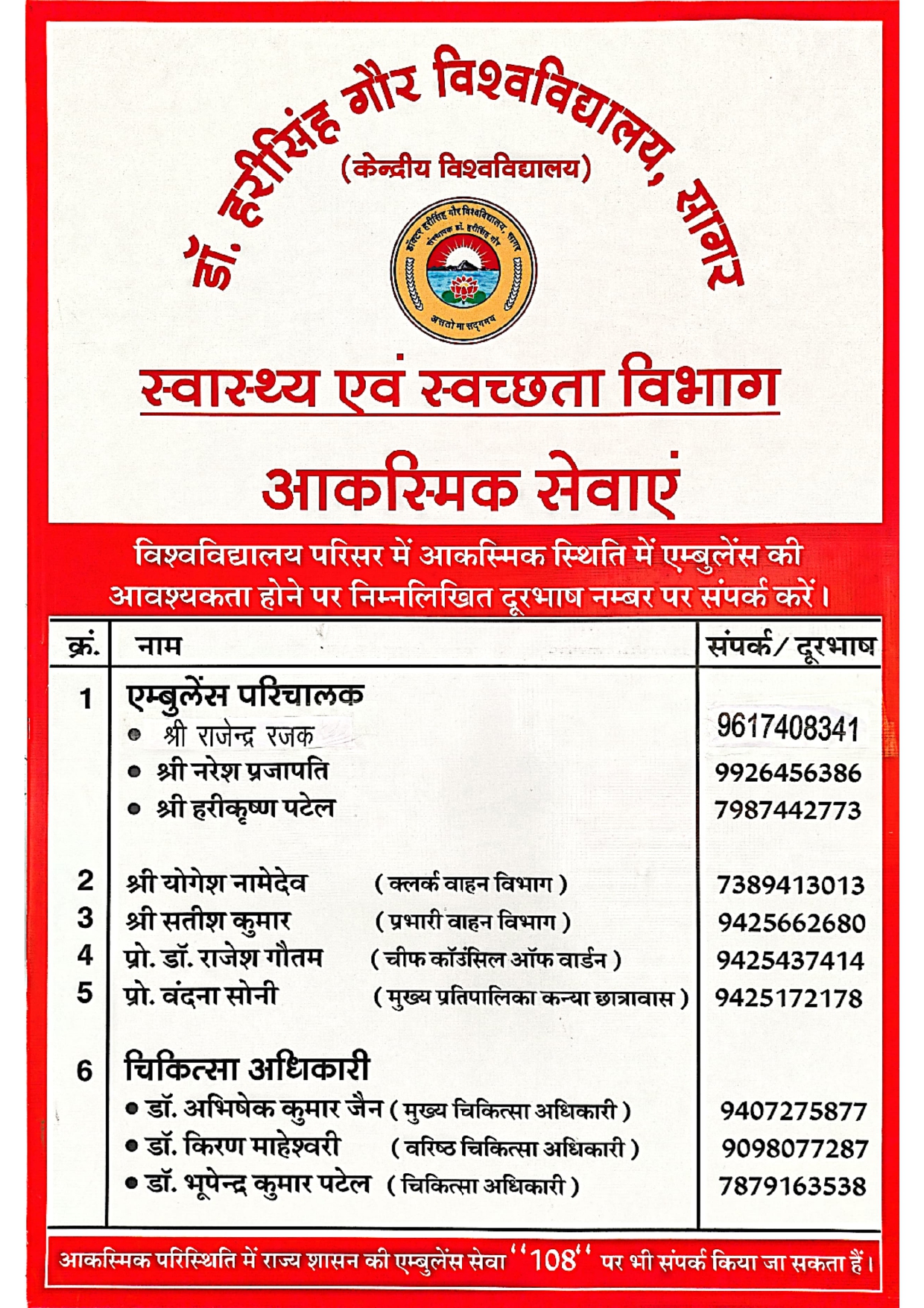 Physical fitness is the first requisite of happiness. To keep body in good health is a duty otherwise we shall not be able to keep the mind strong & clear.” The Health & Sanitation department of Dr. Harisingh Gour University is one of the important unit for the implementation of various health policies & delivery of utmost health care& management of health & sanitation services of the entire campus.