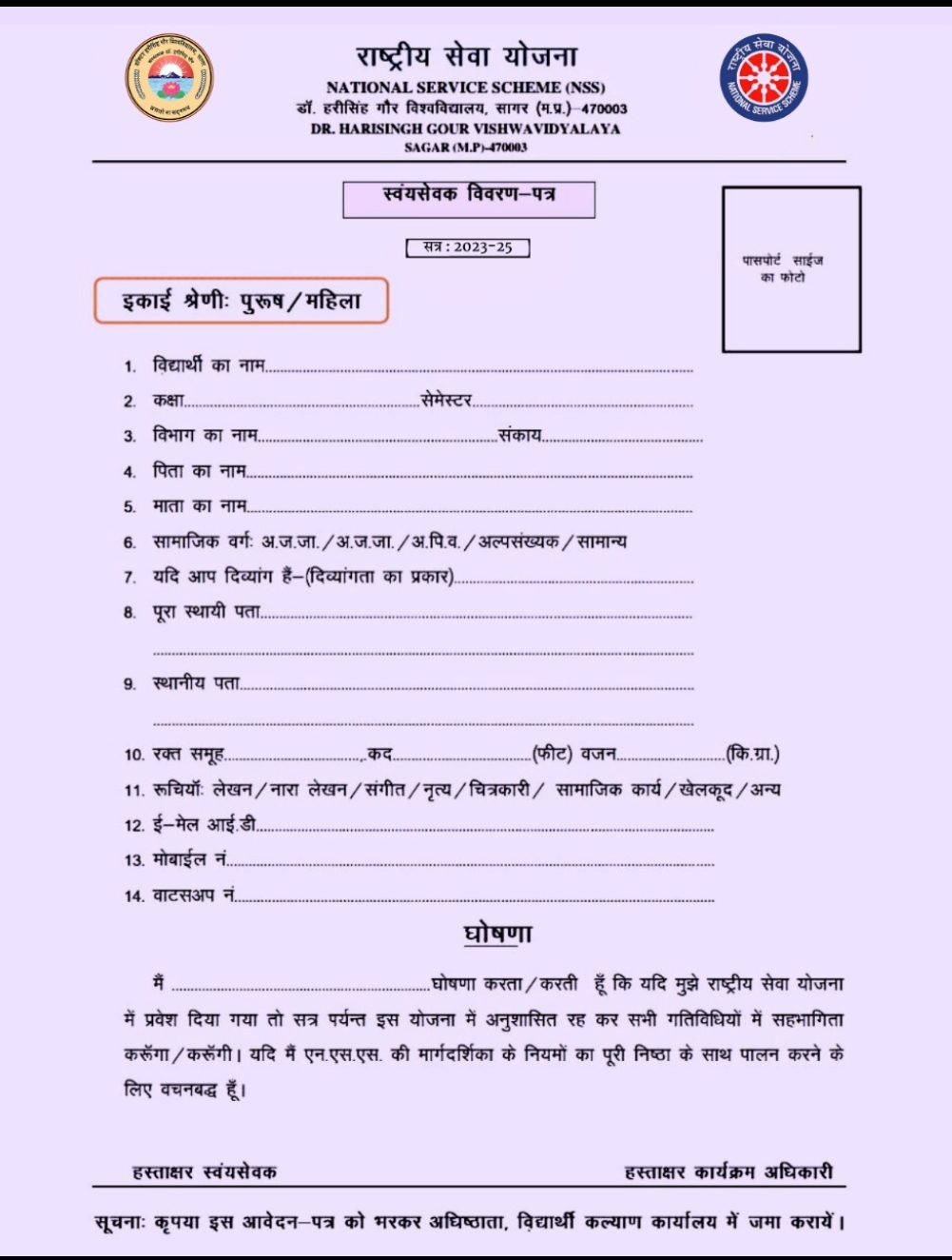 National Service Scheme, under the Ministry of Youth Affairs and Sports Government of India, popularly known as NSS was launched in Gandhi ji's birth centenary year 1969, in 37 universities involving 40,000 students with primary focus on the development of personality of students through community service. Today, NSS has more than 3.2 million student volunteers on its roll spread over 298 Universities and 42 (+2) Senior Secondary Councils and Directorate of Vocational Education all over the country. From its inception, more than 3.75 crore students from Universities, College and Institutions of higher learning have benefitted from NSS activities, as student volunteers. Even before the launching of this scheme in Dr.Harisingh Gour Vishwavidyalaya, Sagar, Madhya Pradesh, all the department programmes were guided by the philosophy of extension& outreach, and the role of co-curricular activities for the all-round development of students has been acknowledged. The National Service Scheme thus continues to uphold and reinforce these traditions with dignity and pride. NSS programme in the Vishwavidyalaya has expanded both qualitatively and quantitatively, and has grown into a mainstream activity over the years. Starting with a sanctioned strength of 200 volunteers, it will be extended with more units in coming sessions.Aim: The programme aims to inculcate social service in students, and to serve the society without any bias. NSS volunteers work to ensure that everyone who is needy gets help to enhance their standard of living and lead a life of dignity. In doing so, volunteers learn from people in villages how to lead a good life despite the scarcity of resources. It also provides help in natural and man-made disasters by providing food, clothing and first aid to the disaster victims. Objectives: The NSS intends to :