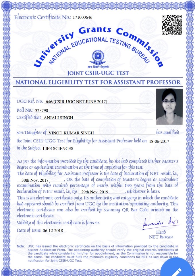 Details of Students from the Department of Biotechnology who have qualified National Exams