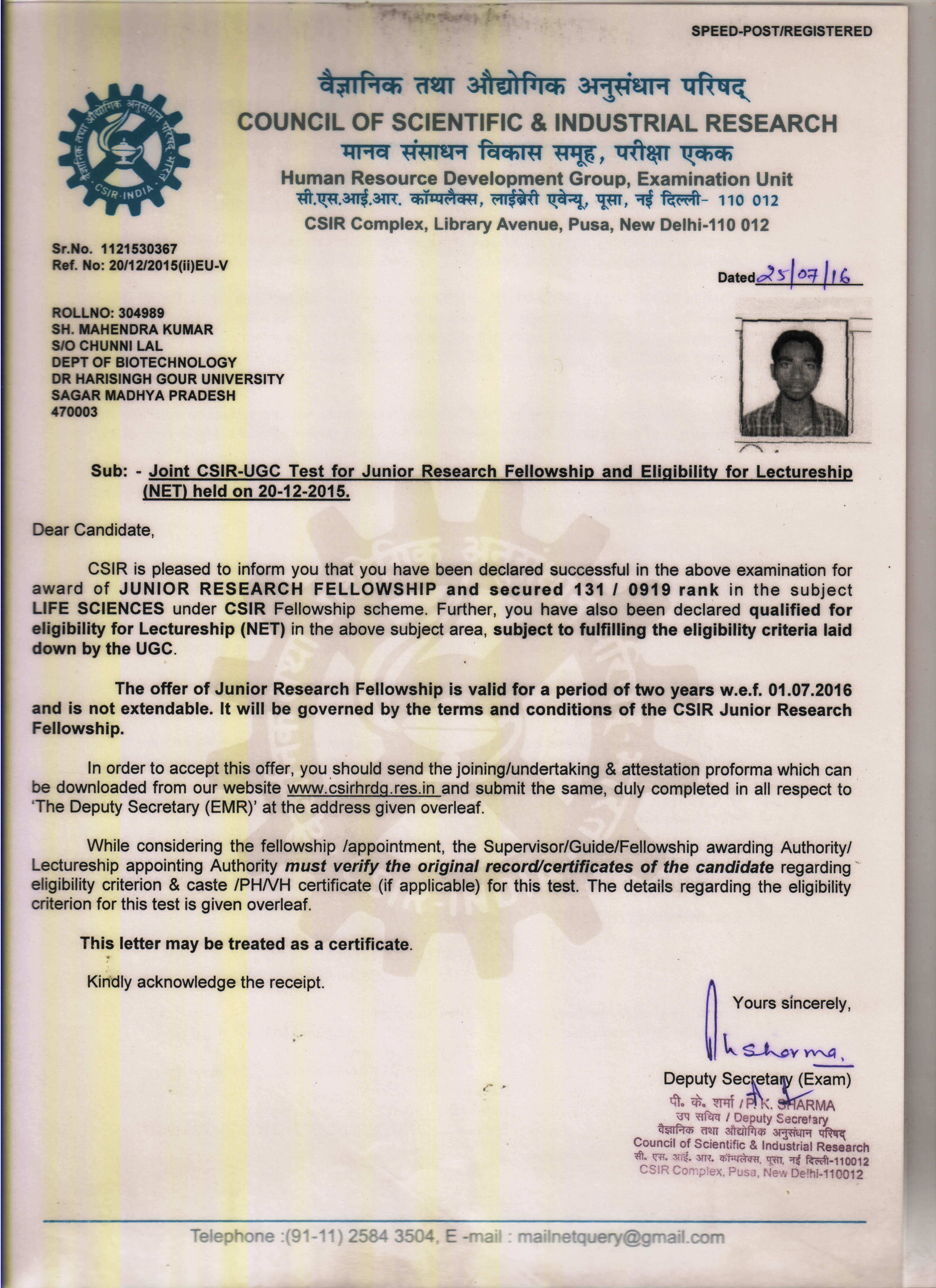| 4 | Mahendra Kumar | 2014-2016 | M.Sc. Biotechnology | NCCS, Pune | Ph.D. |