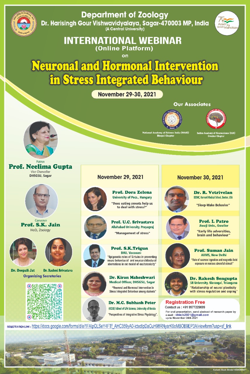 Chair-person in in "Neuronal and Hormonal Intervention in stress Integrated Behaviour" Organised by Department of Zoology, Dr Harisingh Gour Vishwavidyalaya (A Central University), Sagar in collaboration with Indian Academy of Sciences and National Academy of Science, 29th to 30th November, 2021. |